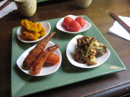 本日は赤カブと里芋のポタージュ、サラダ数種、トマトとさつま芋のグラタン、デザートにココナッツとバナナのプリンを食べました。