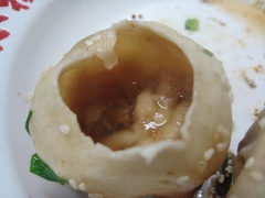 普通のショウロンポウと同じく、中の肉汁を溢さないように食べたいのだが、とにかく熱い。一口でパクッといけば肉汁を無駄にせずに済むけど、熱くて到底無理。上の方をちょこっとだけかじって穴を作り、チューっと吸い込めると成功するけれど、箸が四角くなので持ちにくく安定した面を上にできない!いじくりまわしているうちに、狙った場所ではないところが破れて肉汁が溢れ出てしまい、ああああーーー!!!というジレンマ。