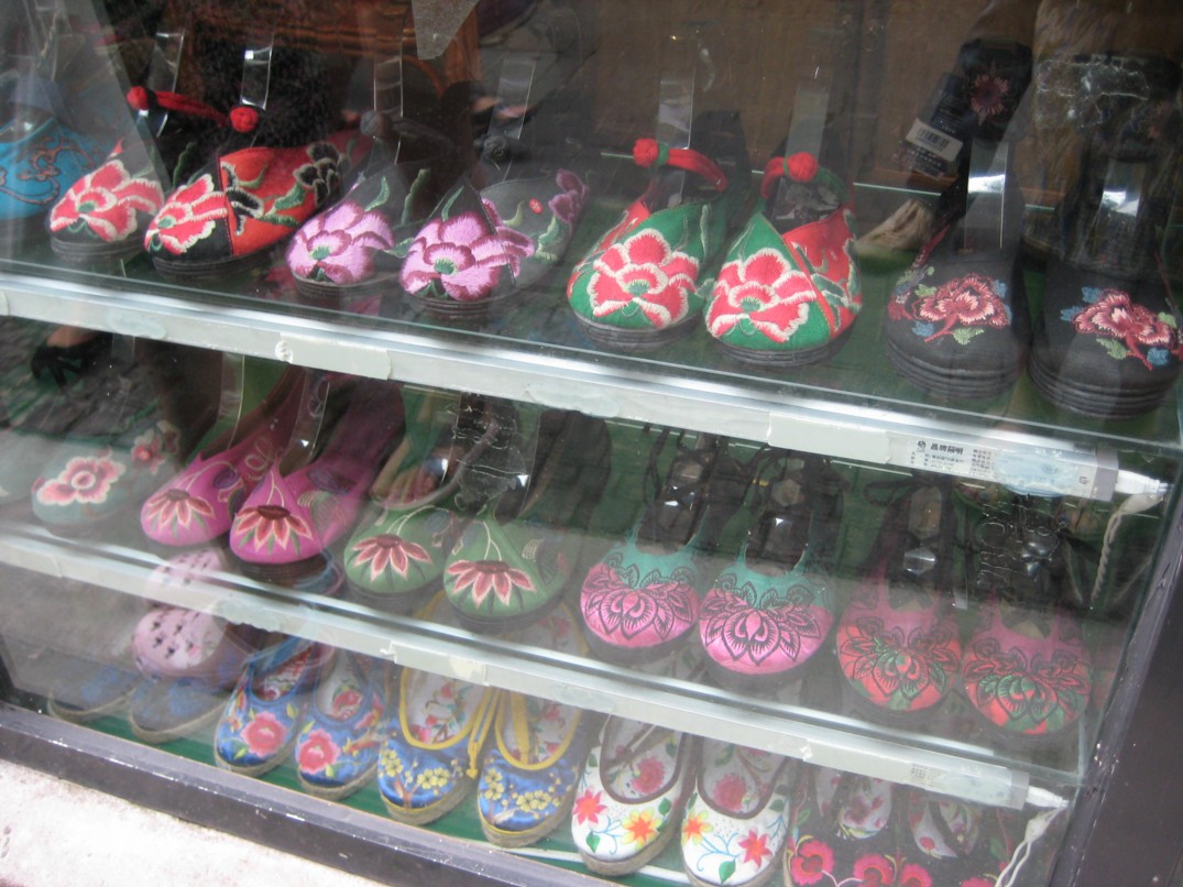 私がチャイナシューズに初めて惹かれたのは、中学生の時に大中という中国雑貨の店でした。昔から刺繍物に弱いのです。初めて中国に来たのは5年前ですが、その時もチャイナシューズや刺繍小物が買える~と期待していましたが、実際はそんなにない。小物はまぁ、お土産屋さんチックなところにはあるけれど、チャイナシューズはあんまり見かけないし、履いている人なんて全然いなーい。もしかして中国の人からするとダサイのかしら…。でも私は大好き!これから探してコレクションするつもりです。履くのがもったいなくて、履けないかもしれませんが。