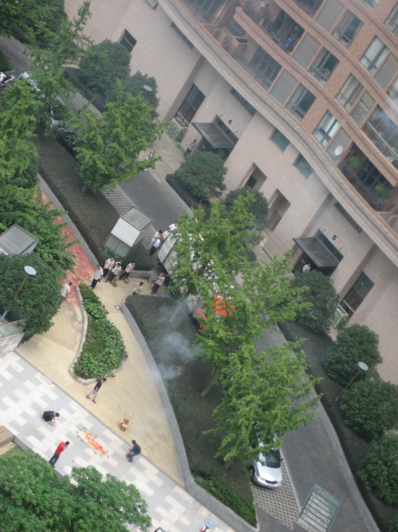 始まるよ~という時の爆竹は、たぶん金網で出来た筒状の入物に爆竹が入っていて、バチバチバチバチ長いこと鳴り、それからは赤バトンみたいな花火みたいなものを、地面に立てて打ち上げたり、宙に投げてパーンと鳴らしたり。投げてるのはちょっと怖い感じしましたが、やってるのは爆竹業者?らしき人とマンションのスタッフで、別にキャーキャー慌てた様子はなく、淡々とやってました。