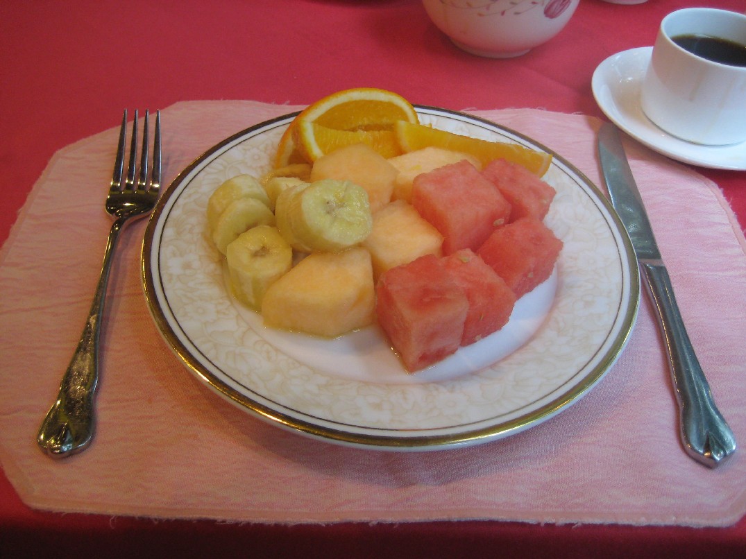 左私:フルーツ盛りだくさん。ビュッフェスタイルの朝食は朝フル主義を通せて嬉しい。