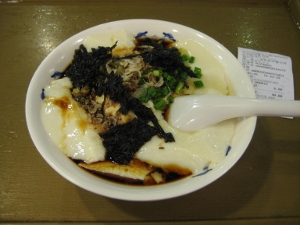私が好きな小吃は「豆腐花」という温かい豆腐に、青葱、ザーサイのみじん切り、アミエビ、岩海苔をトッピングして酢醤油をかけて食べるもの。もー大好き!!!