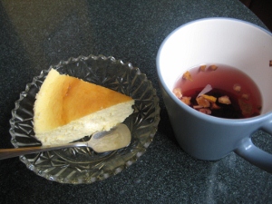 私は珈琲とチョコレートケーキをオーダー。画像は夫が頼んだチーズケーキと無花果茶。